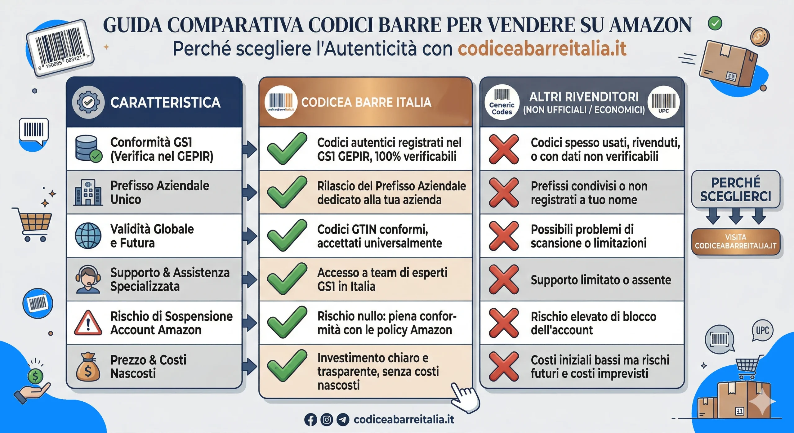 Sebbene Amazon preferisca che i venditori siano licenziatari diretti GS1, l’acquisto di codici tramite il nostro circuito è una pratica consolidata e sicura per migliaia di PMI.